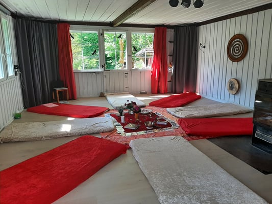 Es hat nicht die Perfektion eines "normalen" Seminarhauses, die ein oder andere Konstruktion ist sicher eigenwillig. Im oberen Stockwerk gibt es 8-10 Schlafplätze (Schlafsaalcharkter), in den unteren Räumen ist Küche, Essplatz und ein Seminarraum. Auf dem Gelände bietet ein Tipi noch mehrere Schlafplätze und auf der Wiese können eigene Zelte aufgestellt werden.